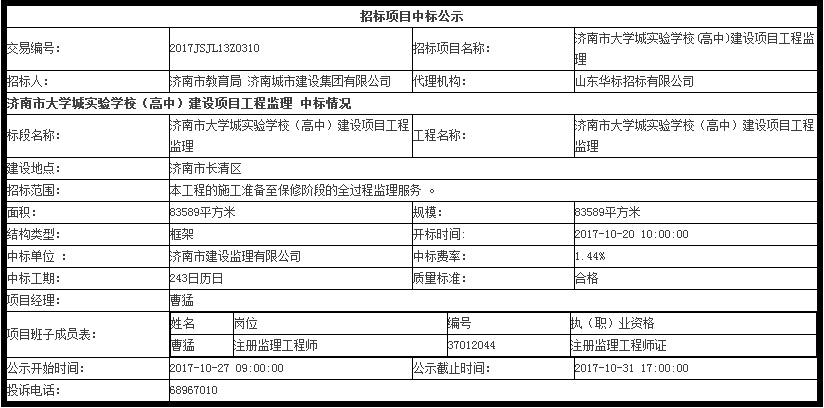 濟南市大學城實驗學校(高中)建設項目工程監理中標公示