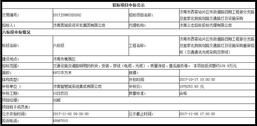 濟南市西客站片區市政道路四期工程采購中標公示