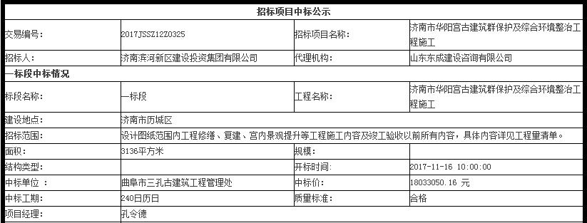 濟南市華陽宮古建筑群保護及綜合環境整治工程施工中標公示