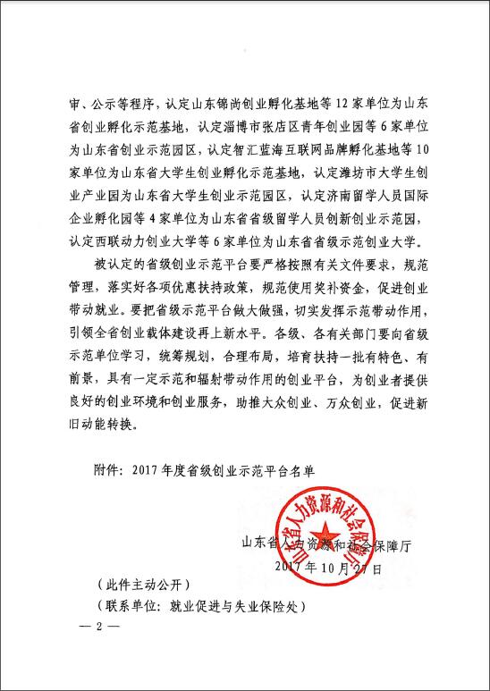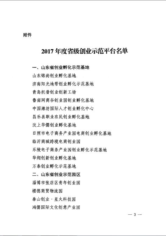 附:山東省人力資源和社會保障廳關于公布2017年度省級創業示范平臺名單的通知
