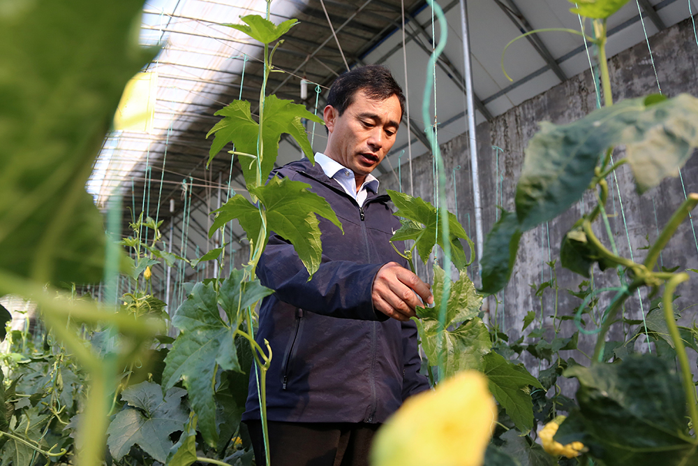 在絲瓜棚,陳德國邊檢查著絲瓜生長情況邊解釋說“這個棚的種植戶貪多,總想著一個藤上結好幾個瓜,但實際上果多不等于產量高,有時候一個藤上好幾個果反而營養供不上了。”對于各類蔬菜種植,經過18年的不斷實踐學習,陳德國逐漸總結出了自己的一套“種植經”。
