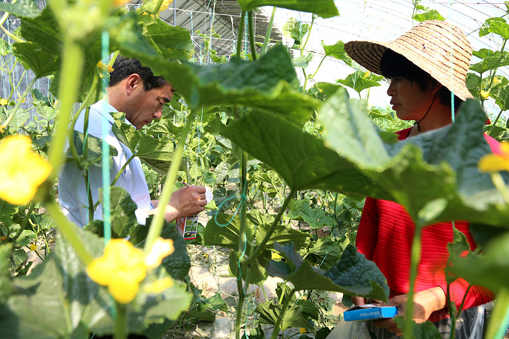 “打藥一定要按時打按量打,提前打了沒效果,拖后了就容易產生殘留,”陳德國仔細指導著黃瓜種植戶。