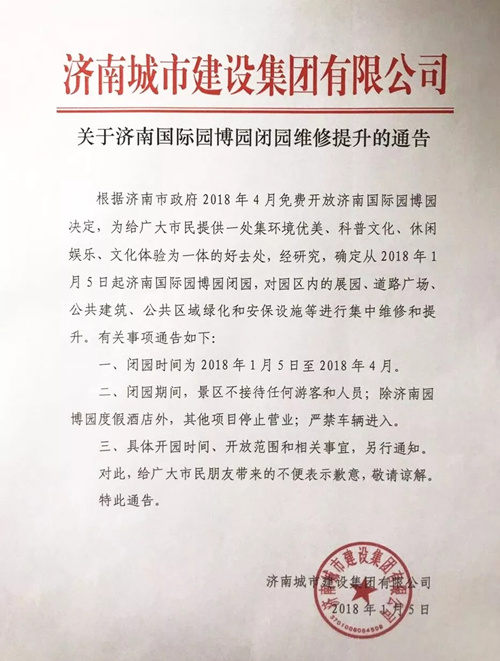 為更好地滿足市民游客休閑娛樂需求,2017年9月6日,市政府(濟政字[2017]56號)確定免費開放濟南國際園博園,明確要求2018年4月實現免費開放。為給廣大市民游客提供一處集環境優美、科普文化、休閑娛樂、文化體驗為一體的好去處,濟南城市建設集團決定即日(2018年1月5日)起對濟南國際園博園進行閉園維修提升改造,現發布《關于濟南國際園博園閉園維修提升的通告》,全文如下: