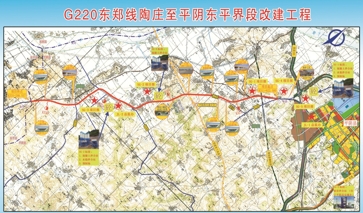 G220東鄭線(xiàn)陶莊至平陰東平界段改建工程項(xiàng)目位于濟(jì)南市平陰縣境內(nèi),路線(xiàn)全長(zhǎng)19.424km,其中利用原路改建段16.635公里,新建段2.789公里。全線(xiàn)設(shè)大橋2座、中橋6座、小橋3座、涵洞53道、隧道440米/1座、分離立交1座,新建養(yǎng)護(hù)工區(qū)1處。全線(xiàn)采用雙向四車(chē)道一級(jí)公路標(biāo)準(zhǔn),設(shè)計(jì)速度80公里/小時(shí),路基寬度一般路段為24.5米;東阿鎮(zhèn)路段路基寬37米,設(shè)置非機(jī)動(dòng)車(chē)道;隧道進(jìn)出口分離路基路段路基寬12.25米,批準(zhǔn)概算6.54億元,計(jì)劃總工期579天。