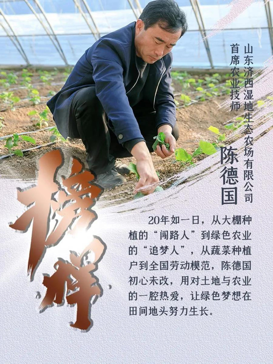作為黃河流域濟(jì)南段的“綠色明珠”,濟(jì)西濕地四季分明、五彩斑斕。濟(jì)南城市建設(shè)集團(tuán)所屬山東濟(jì)西濕地生態(tài)農(nóng)場(chǎng)有限公司連片的蔬菜大棚里,首席農(nóng)業(yè)技師陳德國(guó)早出晚歸、“兩頭不見太陽(yáng)”,無(wú)暇欣賞這近在遲尺的變幻景色,但他卻看得見春耕夏種、秋收冬藏,在深耕細(xì)作中收獲豐收的喜悅。20年如一日,從大棚種植的“闖路人”到綠色農(nóng)業(yè)的“追夢(mèng)人”,從蔬菜種植戶到全國(guó)勞動(dòng)模范,陳德國(guó)初心未改,用對(duì)土地與農(nóng)業(yè)的一腔熱愛,讓綠色夢(mèng)想在田間地頭努力生長(zhǎng)。