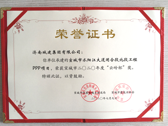 近日,由集團所屬濟南城建集團有限公司承建的宣城市水陽江大道閉合段北段工程PPP項目、宛陵東路(拱極路—宛溪北路)工程榮獲宣城市2020年度“云嶺杯”獎。