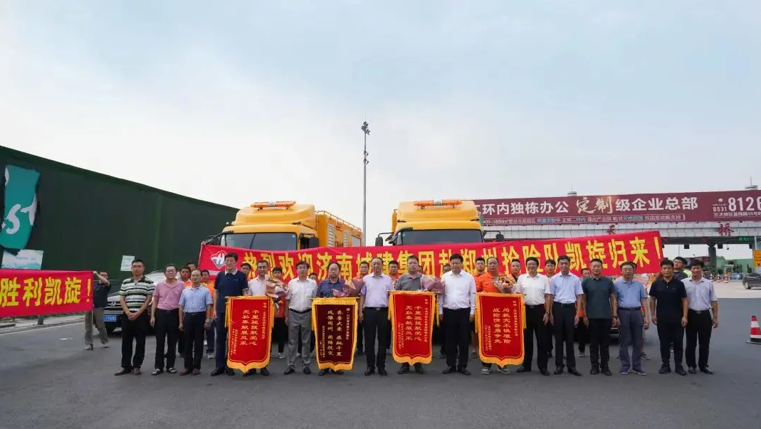 7月25日一早,城建集團(tuán)公司應(yīng)急搶險隊經(jīng)過休整準(zhǔn)備返濟時,鄭州惠濟區(qū)老百姓自發(fā)來到現(xiàn)場,為救援隊員們送上鮮花、食品等禮物,拉起“歡送山東省住建廳救援隊英雄們平安回家”“向搶險救災(zāi)的英雄致敬”的條幅,夾道歡送應(yīng)急救援隊。