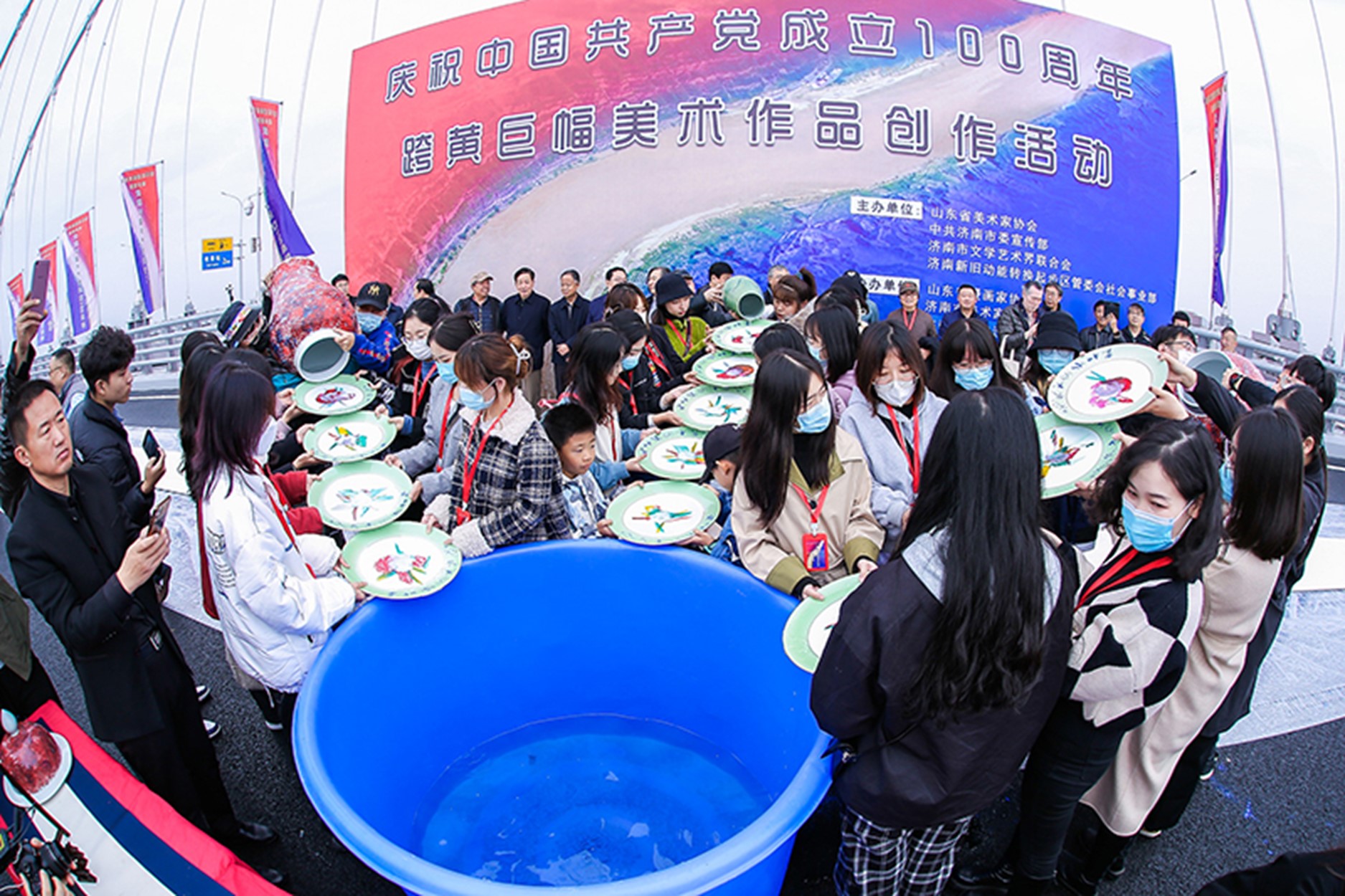 為助力黃河重大國(guó)家戰(zhàn)略實(shí)施,在新時(shí)代現(xiàn)代化強(qiáng)省會(huì)建設(shè)和服務(wù)全市改革發(fā)展大局中彰顯文化擔(dān)當(dāng),11月6日,山東省美術(shù)家協(xié)會(huì)、中共濟(jì)南市委宣傳部、濟(jì)南市文學(xué)藝術(shù)界聯(lián)合會(huì)、濟(jì)南新舊動(dòng)能轉(zhuǎn)換起步區(qū)管委會(huì)社會(huì)事業(yè)部在濟(jì)南鳳凰黃河大橋聯(lián)合組織舉辦慶祝中國(guó)共產(chǎn)黨成立100周年跨黃巨幅美術(shù)作品創(chuàng)作活動(dòng)。活動(dòng)旨在進(jìn)一步保護(hù)、傳承和弘揚(yáng)黃河文化,深入挖掘黃河文化的時(shí)代價(jià)值,以優(yōu)秀的藝術(shù)作品記錄新時(shí)代、謳歌新時(shí)代,為“文化濟(jì)南”建設(shè)貢獻(xiàn)文藝力量。
