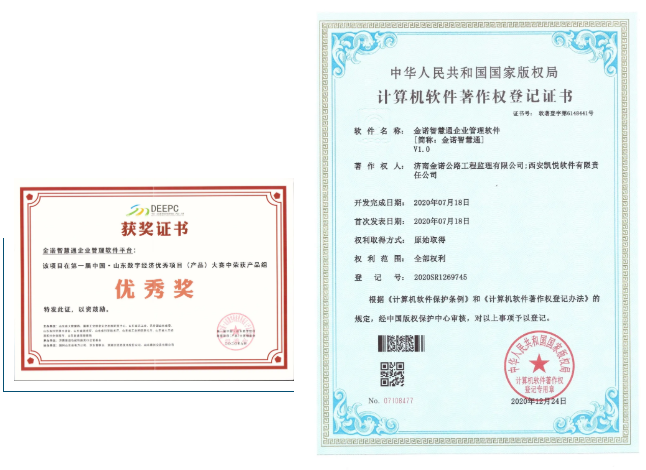 2020年,金諾公司與西安凱悅軟件有限責任公司合作,研發了“金諾智慧通”企業管理軟件,于2020年12月取得中國版權保護中心頒發的軟件著作權登記證書。“金諾智慧通”參加了第一屆中國(山東)數字經濟優秀項目(產品)大賽,并獲得產品組“優秀獎”。同時,2020年下半年推動的針對公路工程建設開發的“路面三維剖面破損(病害)自動檢測系統”、“橋梁在線監測系統”等8個軟件已申報軟件著作權登記,軟件著作權登記證書已于2021年3月份下發。