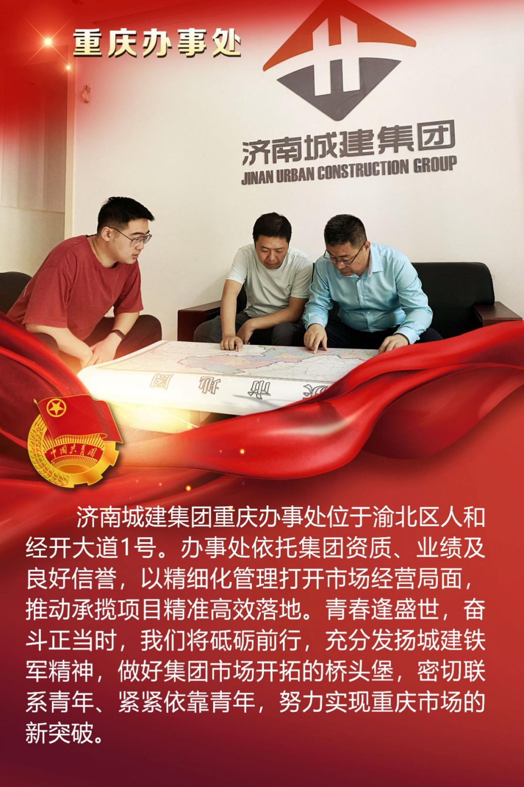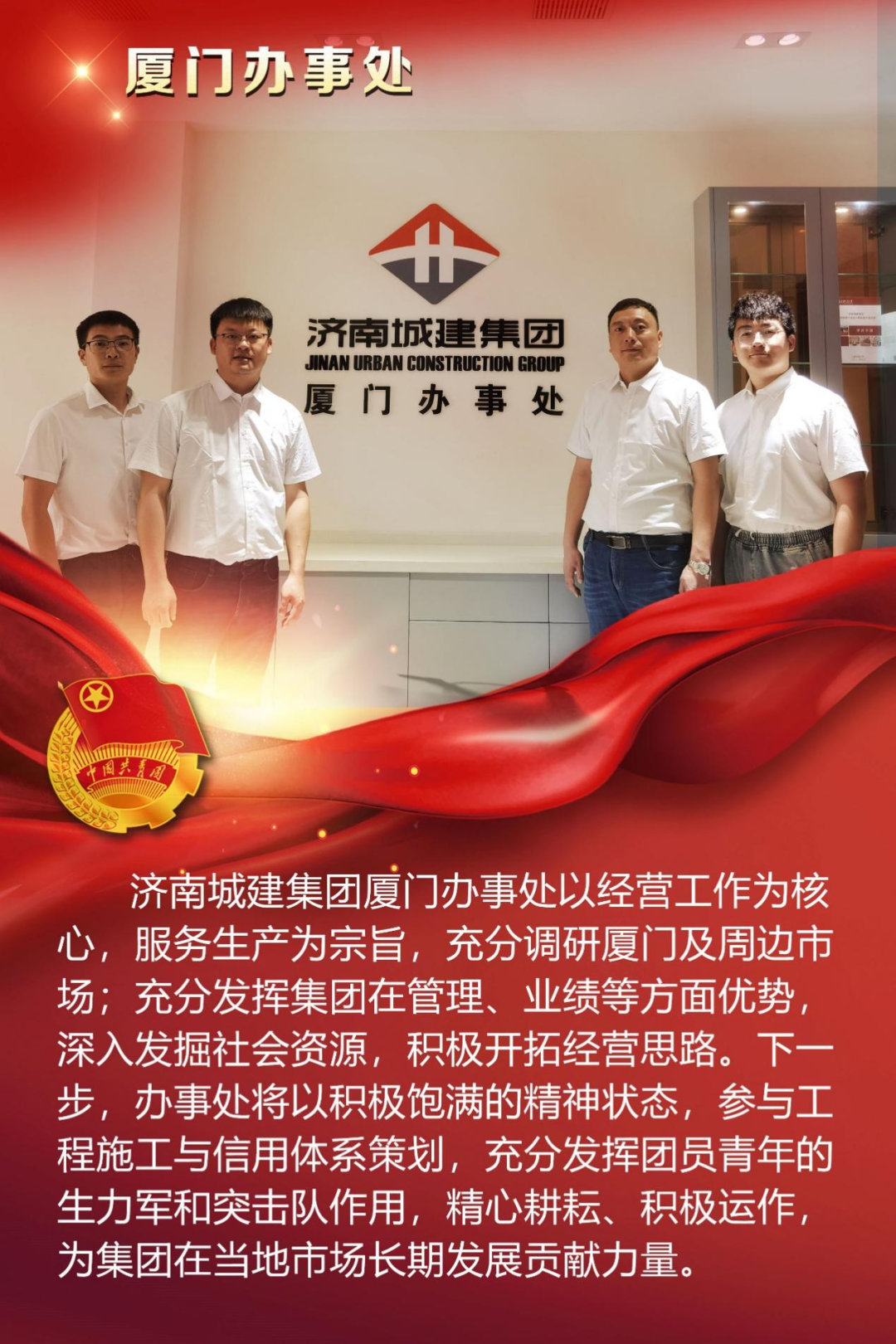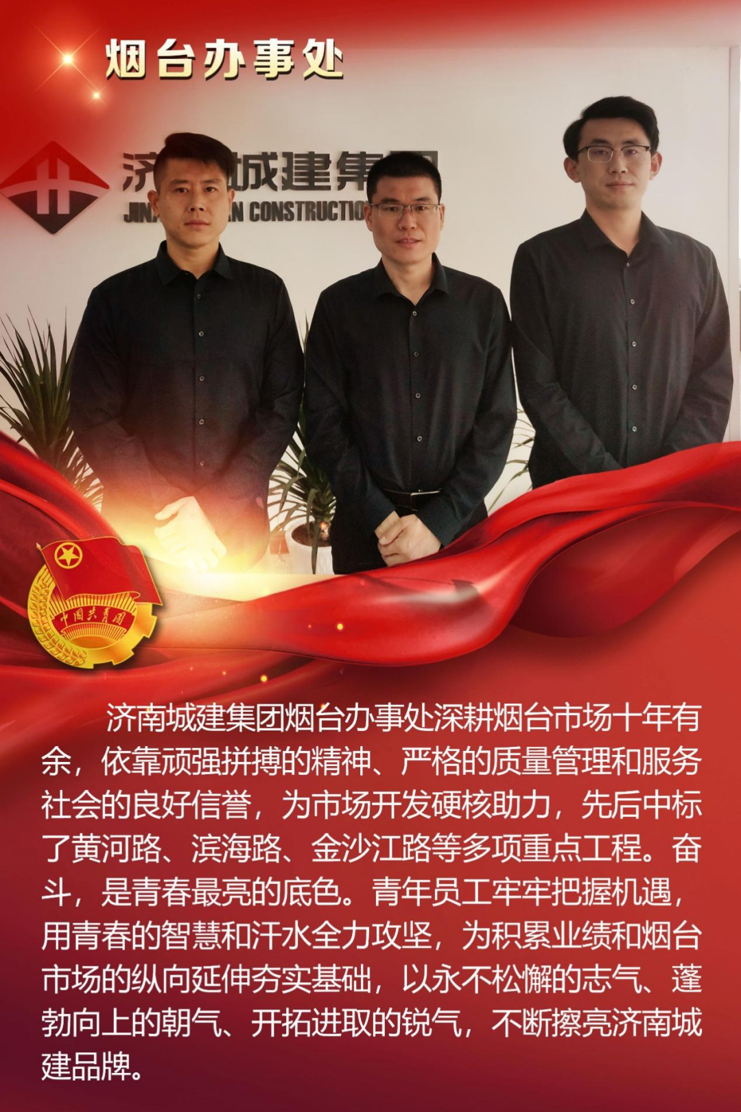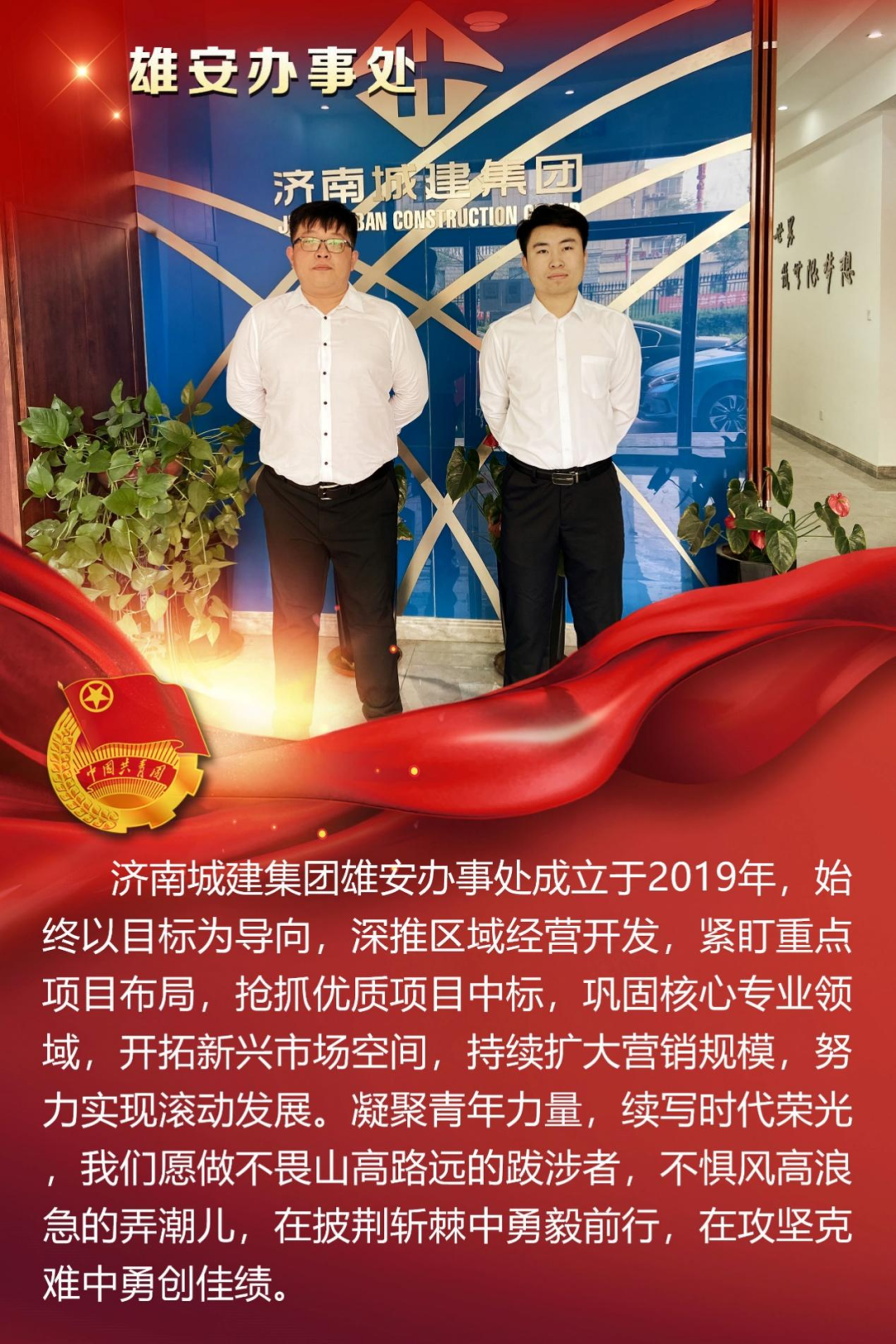 為慶祝中國共產主義青年團成立100周年,深情回顧共青團發展歷程,進一步增強廣大團員青年敬團、愛團意識,提升團組織的凝聚力和向心力,展示公司團員青年積極向上、奮發有為的精神風貌,集團第四團委——濟南城建集團有限公司團委組織開展團旗在城建飄揚合影活動。