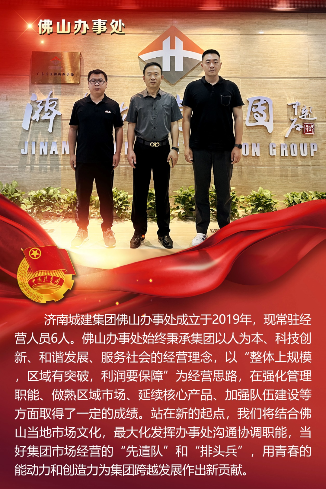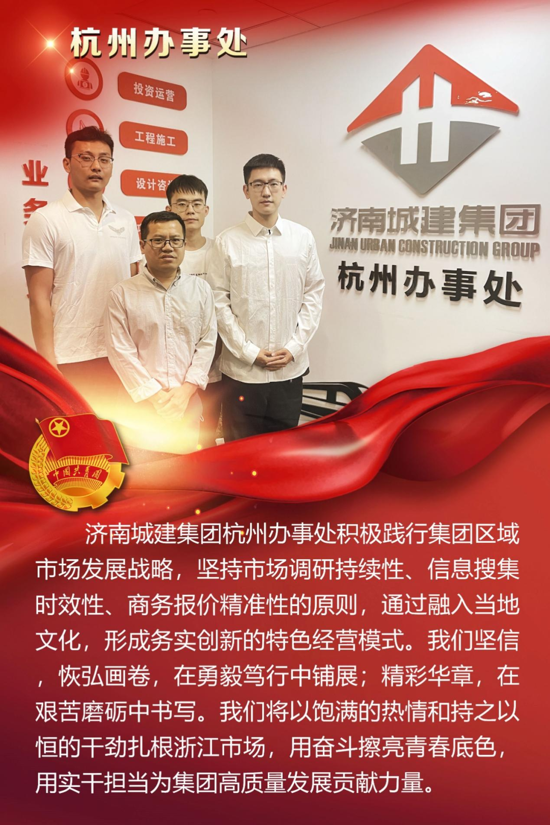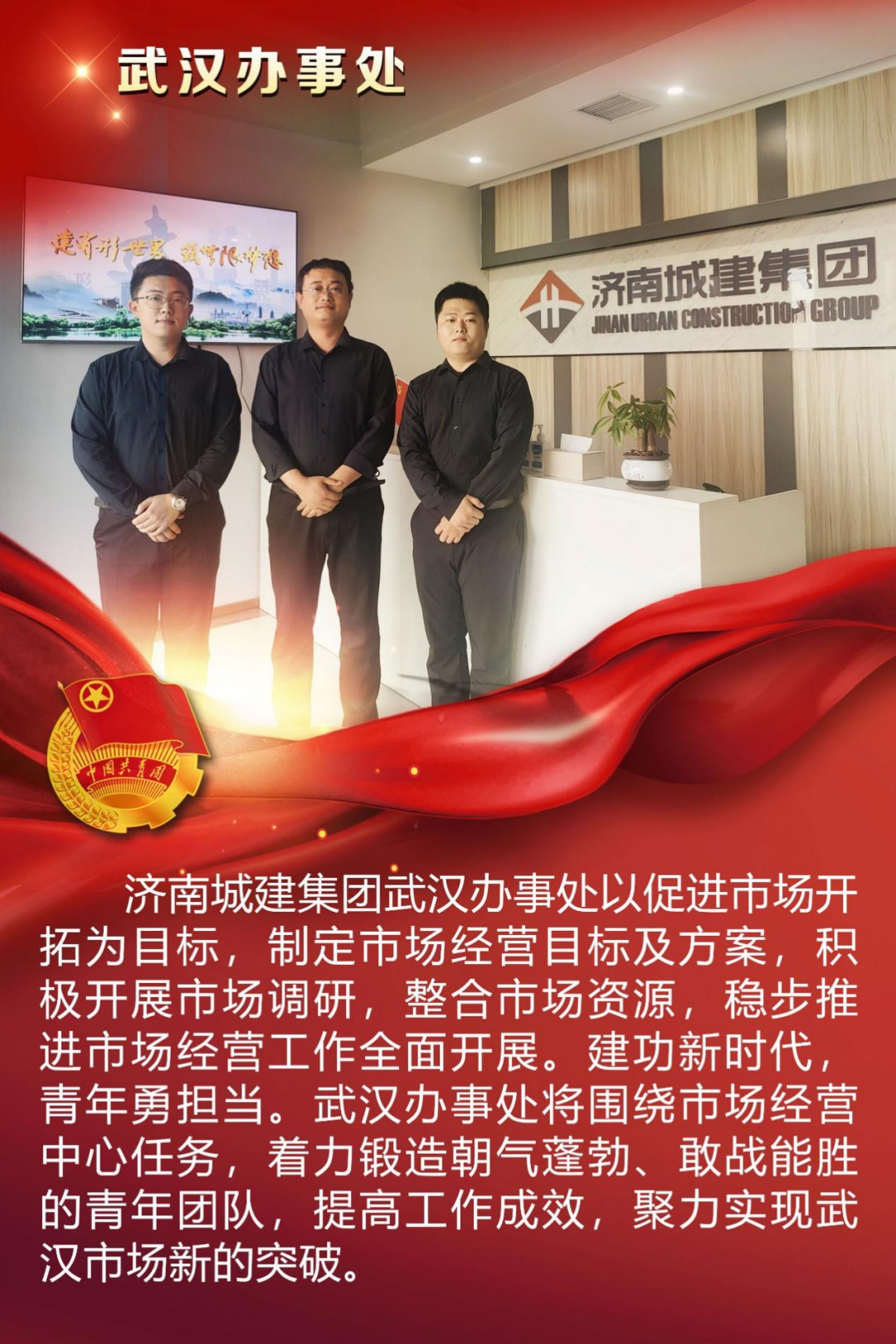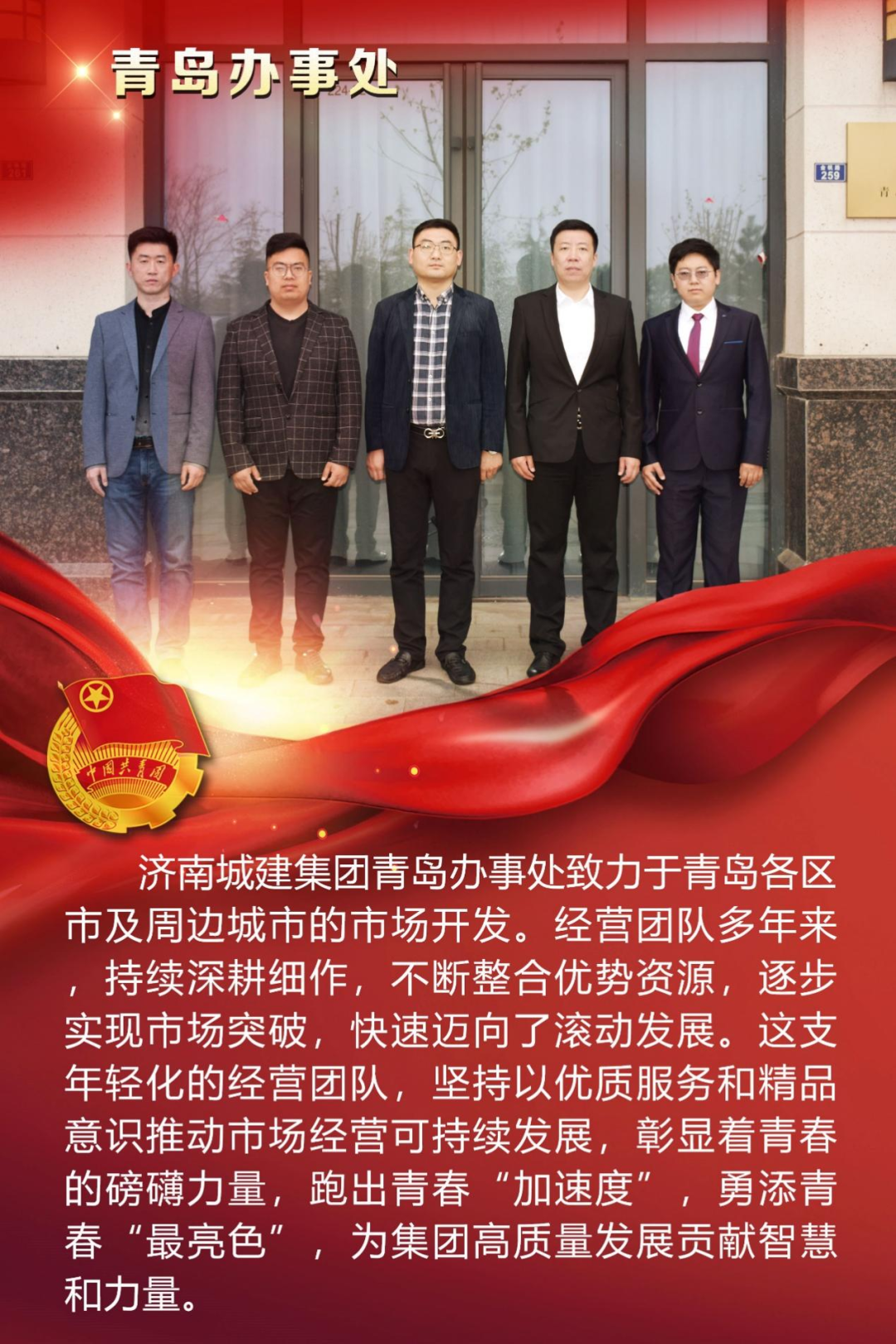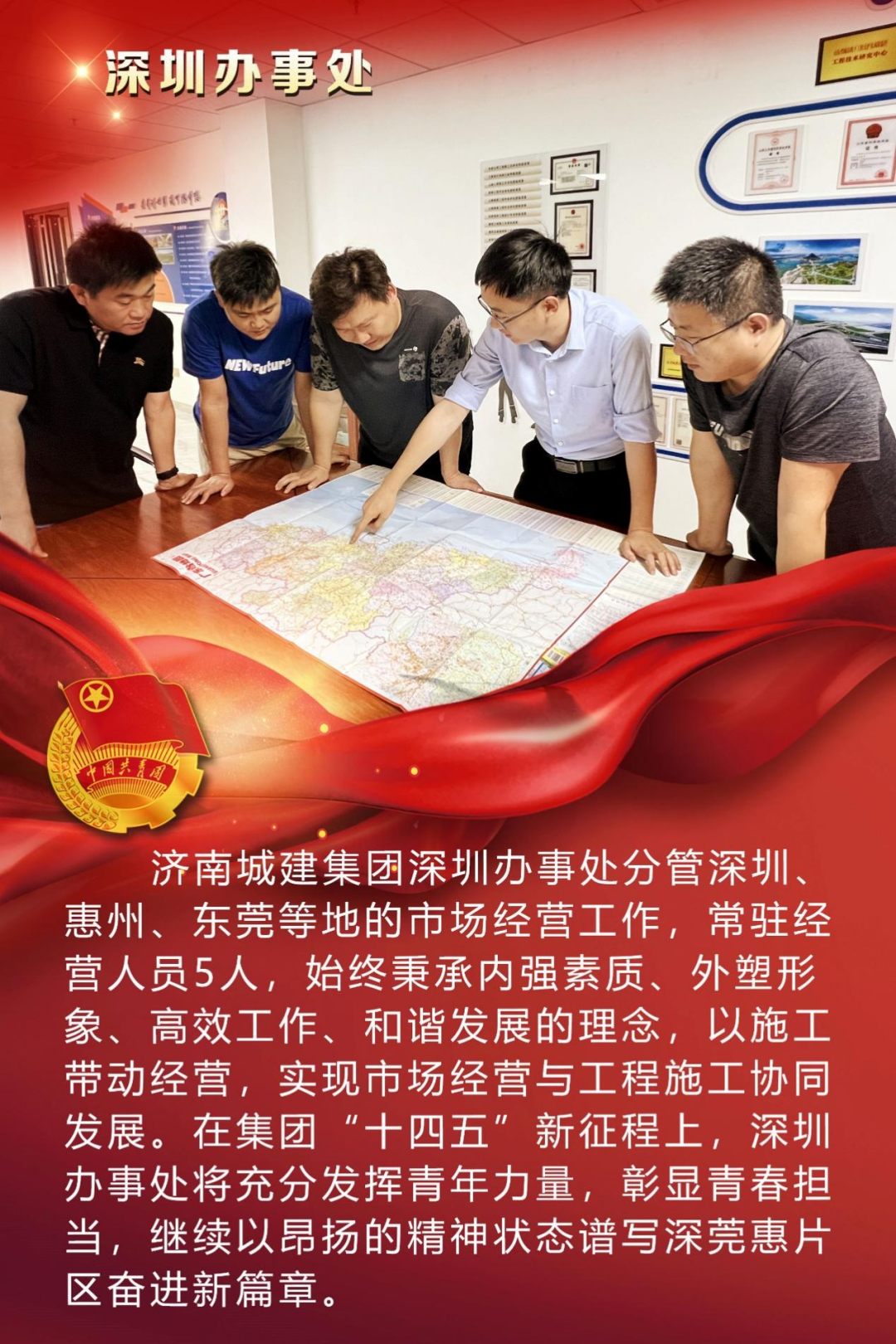 為慶祝中國共產主義青年團成立100周年,深情回顧共青團發展歷程,進一步增強廣大團員青年敬團、愛團意識,提升團組織的凝聚力和向心力,展示公司團員青年積極向上、奮發有為的精神風貌,集團第四團委——濟南城建集團有限公司團委組織開展團旗在城建飄揚合影活動。