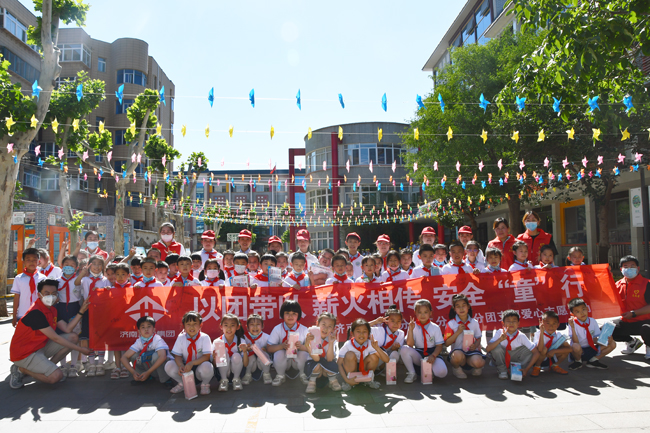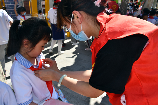 活動中,志愿者身著紅色志愿者馬甲,與小朋友們進行親密互動,為孩子們佩戴少先隊隊徽,以通俗易懂的方式為大家講解少先隊知識、安全防疫知識,提醒提高安全防護意識。志愿者們與小朋友們有說有笑,其樂融融,為小朋友們送去集團的關愛和祝福,祝愿孩子們開心快樂成長。孩子們用整齊的少先隊禮回應志愿者,稚嫩的童顏上洋溢著燦爛的笑容。