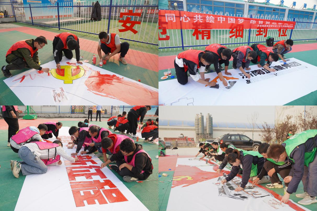 伴隨著激昂的團(tuán)歌,白色畫卷在地上一字鋪開,青年職工們手拿畫筆圍在兩側(cè),用五彩斑斕的顏料繪制起波瀾壯闊的畫卷,一筆一畫深情地表達(dá)出對黨和國家的美好祝愿。每個(gè)線條都蘊(yùn)藏著青年職工永遠(yuǎn)跟黨走、筑夢新時(shí)代的堅(jiān)定信念。