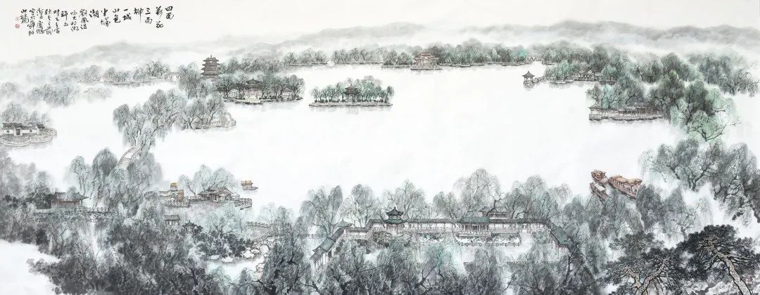 如果將濟(jì)南的明信片寄往遠(yuǎn)方,大明湖一定是其中的選擇。濟(jì)南市文聯(lián)副主席、濟(jì)南市美術(shù)家協(xié)會(huì)主席李慶杰為此次畫(huà)展創(chuàng)作的《名湖攬勝》作品,將大明湖舊貌新顏相融合,“四面荷花三面柳,一城山色半城湖”“佛山倒影”等意境躍然紙上,體現(xiàn)了近些年來(lái)天更藍(lán)、樹(shù)更綠、水更清的高質(zhì)量發(fā)展“濟(jì)南高度”。