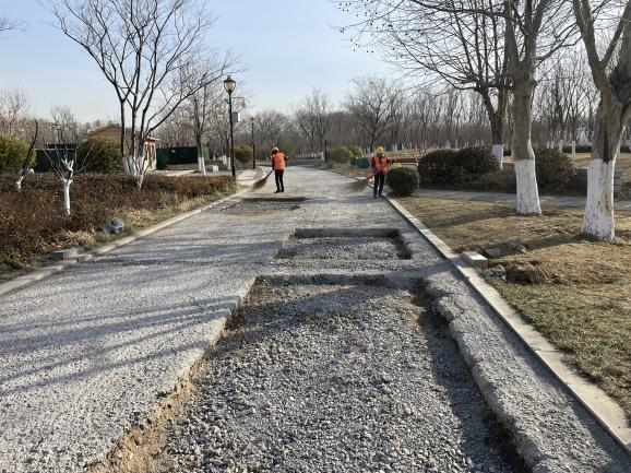 針對市民反映的補修華山湖北岸部分道路的訴求,集團高度重視,工程二部相關工作人員立即到現場實地勘察,組織編制整修方案,確定將上部松散面層銑刨后,更換為瀝青面層,并于2月28日進場實施。科學組織,加強調度,在保護公園環境及周邊既有設施不遭破壞的基礎上,于3月25日施工完成,比預計時間提前一周。