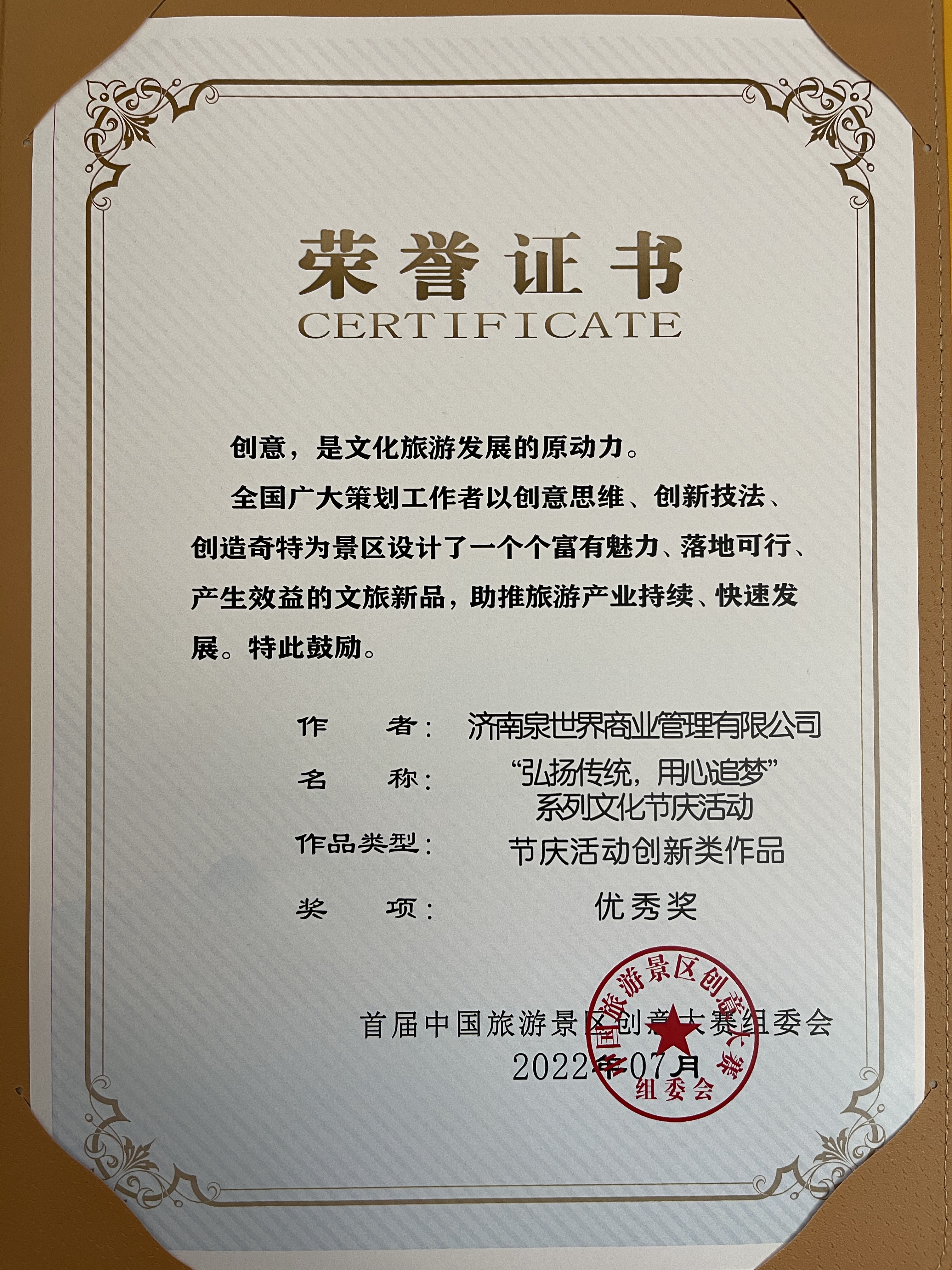 為推動文旅產(chǎn)業(yè)提標(biāo)提效發(fā)展,豐富文化內(nèi)涵,激發(fā)創(chuàng)意思維,增強(qiáng)旅游市場活力,近日,由中國旅游景區(qū)協(xié)會主辦的首屆中國旅游景區(qū)創(chuàng)意大賽頒獎典禮暨創(chuàng)意論壇在白音哈達(dá)旅游度假區(qū)舉辦。濟(jì)南泉世界商業(yè)管理有限公司運(yùn)營管理的印象濟(jì)南·泉世界景區(qū),正在積極創(chuàng)建國家4A級旅游景區(qū),一直以來十分注重景區(qū)運(yùn)營管理工作創(chuàng)新發(fā)展,組織了五項(xiàng)內(nèi)容參加了此次創(chuàng)意大賽,與全國各大知名旅游景區(qū)提交的200多份創(chuàng)意作品進(jìn)行角逐,最終有四份創(chuàng)意作品獲獎。其中:《節(jié)慶活動創(chuàng)新類作品》《營銷模式開發(fā)類作品》獲得優(yōu)秀獎,《導(dǎo)游說景文編類作品》《旅游線路拓新類作品》獲得入圍獎。