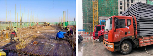 項(xiàng)目整體實(shí)行閉環(huán)管理,工人生活區(qū)位于項(xiàng)目?jī)?nèi)部,從而保證項(xiàng)目封控期間各樓棟作業(yè)人員工種數(shù)量齊全,關(guān)鍵崗位不空缺,保障了項(xiàng)目生產(chǎn)“人力”。面對(duì)封控、材料供應(yīng)、運(yùn)輸困難等問題,項(xiàng)目部提早謀劃,現(xiàn)場(chǎng)優(yōu)化布局,提前儲(chǔ)備關(guān)鍵物資,如鋼筋、預(yù)制構(gòu)件、保溫板等材料,同時(shí)物料進(jìn)出場(chǎng)進(jìn)行專班管理,提前報(bào)備、專人接送、封條張貼、專人盯守、過渡區(qū)消殺等管控流程配合嚴(yán)密,保障了項(xiàng)目生產(chǎn)“物力”。