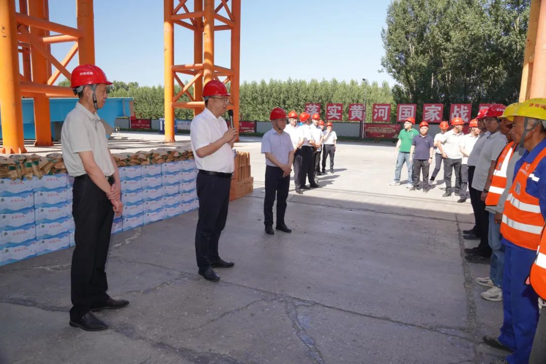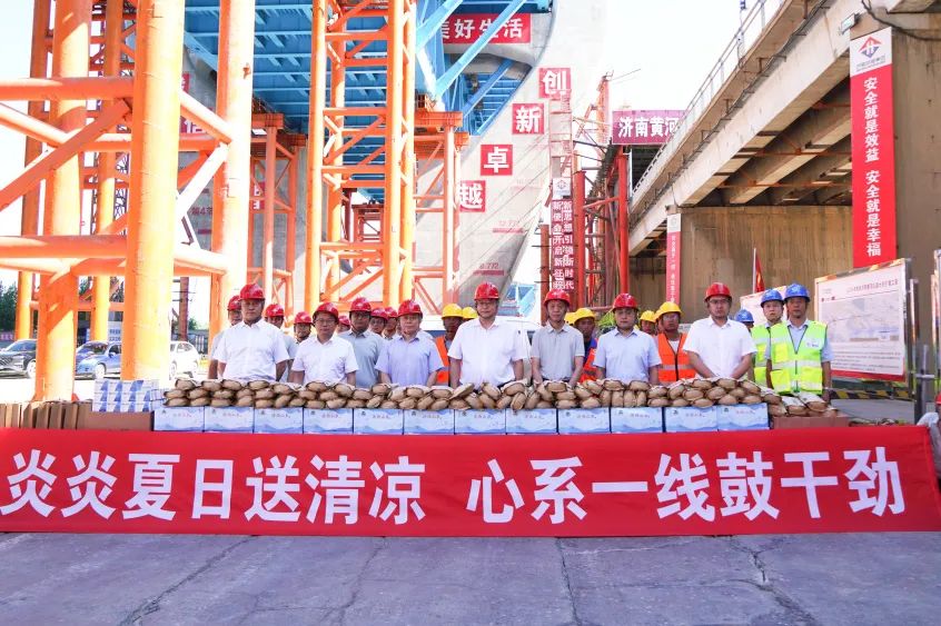 活動中,史海成一行先后前往 G104 濟南黃河公路大橋擴建項目、黃河體育中心專業足球場項目,詳細了解了現場施工進度、工程質量、安全文明施工等情況,并與一線員工親切交流,感謝他們長期以來為項目建設及企業發展作出的貢獻,為一線員工發放防暑降溫物資。