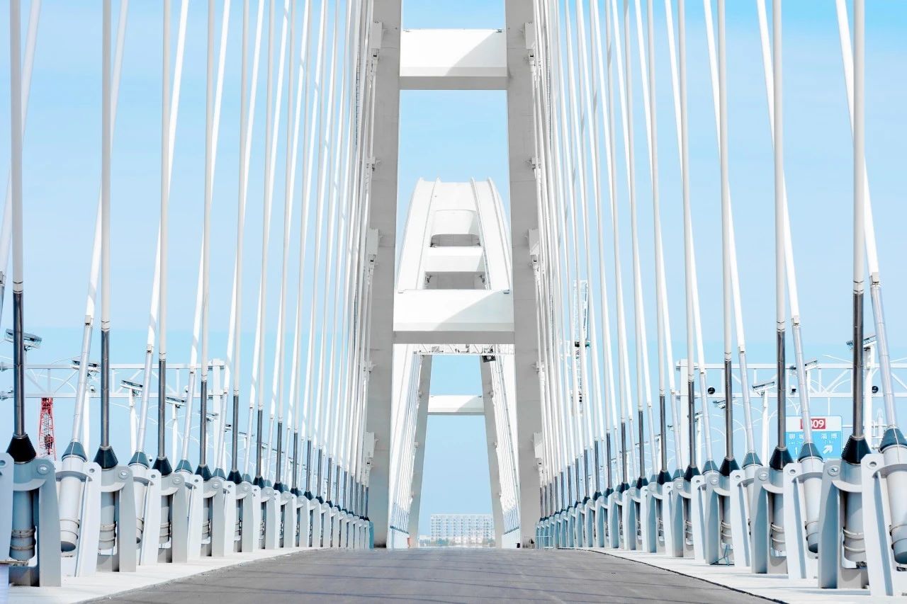 大橋橋塔整體造型源于“水滴”曲線線條,剛?cè)嵯酀?jì),輕盈通透,使橋梁與環(huán)境更有效的融合,也寓意著水文化對(duì)于濟(jì)南這座城市的特殊意義,象牙白橋塔搭配水藍(lán)色鋼桁梁,則與泉水遙相呼應(yīng)相得益彰。