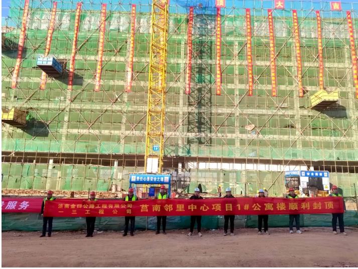 鄰里中心項目是臨沂市觀摩項目,涉及鋼結構、鋼筋混凝土結構、幕墻工程、裝飾裝修、安裝工程、電梯工程、ALC墻板工程等多個專業性較強的領域,工期緊、任務重,給項目團隊帶來了很大的挑戰。項目部周密策劃組織施工,積極落實質量安全交底,統籌調配人材機配置與進場,鉚足干勁、團結協作,每天召開例會各個擊破現場問題,不斷提高施工效率、質量。12月15日,項目公寓樓順利封頂,標志著項目建設取得階段性勝利。